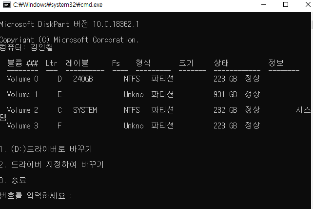 set /p DRIVE-1=D 드라이브로 변경 할 볼륨 "문자(Ltr)"를 입력하세요 :
