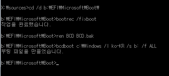 - BCD 재생성을 위해 bcdboot c:\Windows /l ko-KR /s b: /f ALL 명령을 입력 하고 엔터를누릅니다.