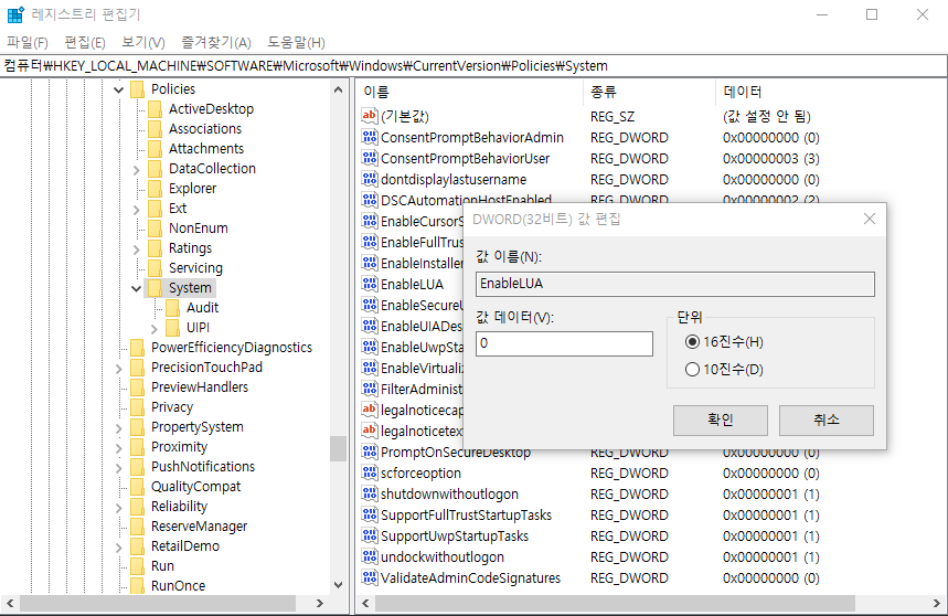 사용자 계정 컨트롤 : 기본 제공 관리자 권한 "FilterAdministratorToken" 수동 설정