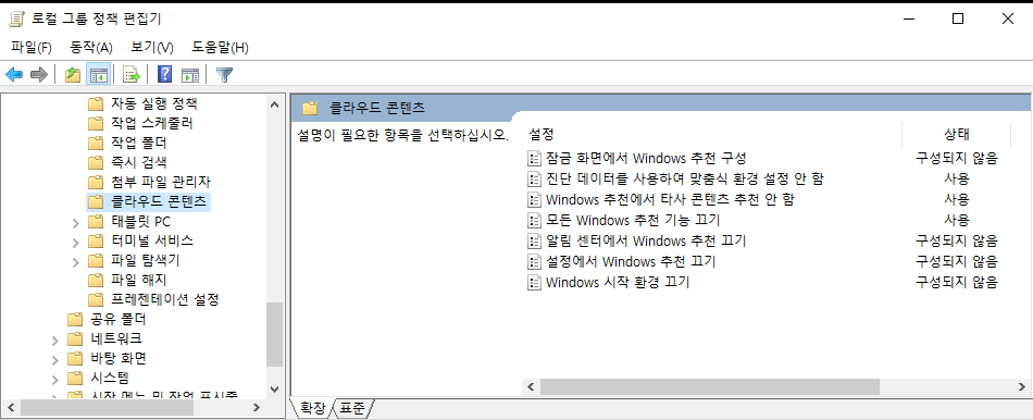 실행 - gpedit.msc - 사용자 구성 - Windows 구성 요소 - 클라우드 콘텐츠