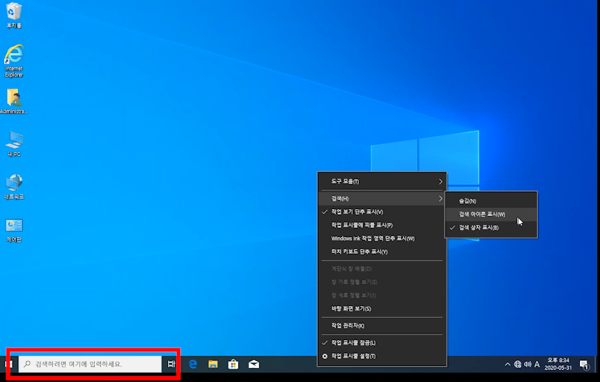 작업표시줄에서 마우스 오른쪽 버튼 클릭 -> 검색 -> 검색 아이콘 표시