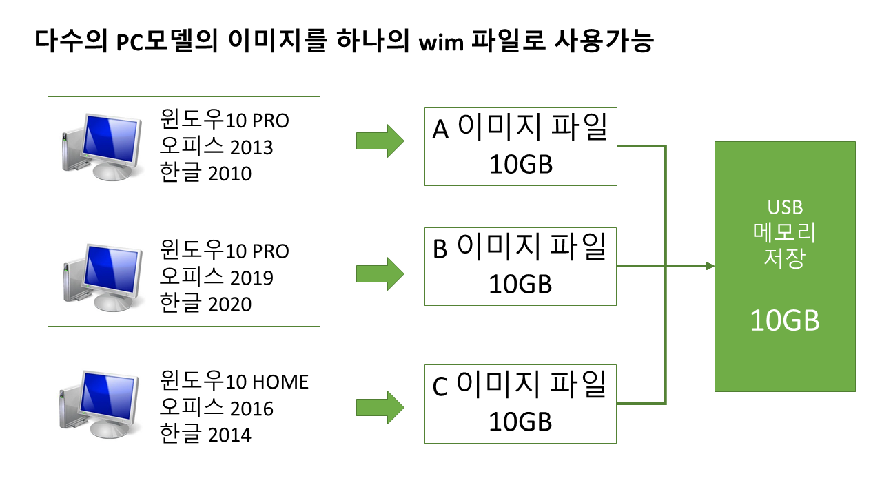 하드웨어 다른 각각의 컴퓨터와 PC별 각가의 소프트웨어를 설치하여도 하나의 wim image 합칠 수 있음.
