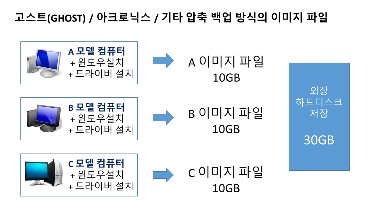 예전에 많이 사용하던 방식 고스트(Ghost), 아크로닉스(Acronis) 경우, 각각의 이미지 파일로 보관