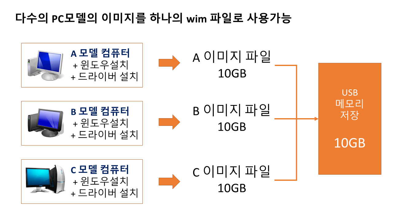 Wim 이미지 방식은 여러 PC 모델의 이미지를 하나의 wim 파일로 통합하여 사용가능.