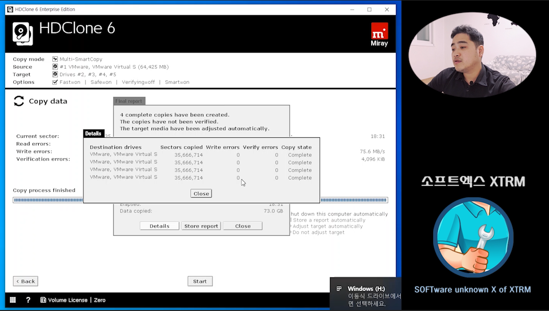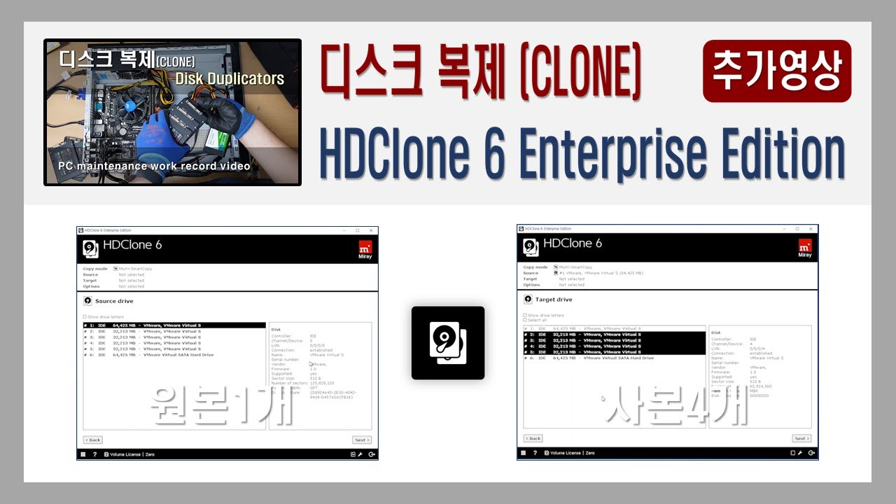 구글 검색으로 HDClone 6 Enterprise Edition 다운로드 받아 가상디스크 1대4로 복제 테스트 영상입니다.