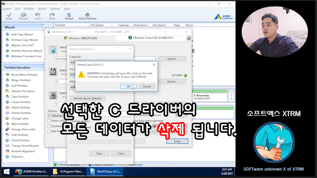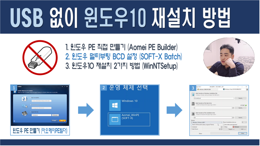 USB 메모리 없이 윈도우10 재설치 방법입니다. 아오메이 (Aomei PE Builder) 윈도우 PE wim 파일 직접 만들어서 현재 컴퓨터의 윈도우 BCD 수정하여 윈도우 멀티부팅으로 PE 들어가서 WinNTSetup 유틸리티로 윈도우 재설치하는 두가지 방법을 영상에 담았습니다.
