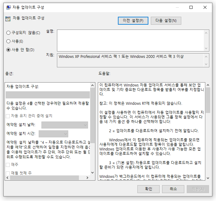 자동 업데이트 구성 - 사용 안 함 - 확인