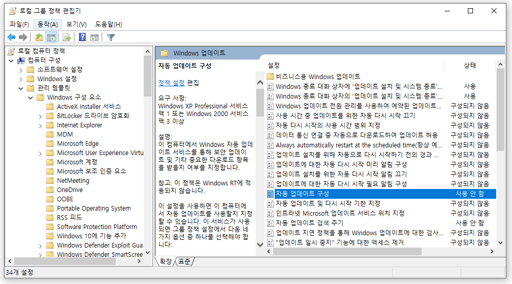 윈도우10 로컬 그룹 정책 편집기 (gpedit.msc) 설정으로 자동 업데이트 강제 끄기