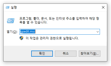 실행 명령창에 gpedit.msc 입력 -> 확인