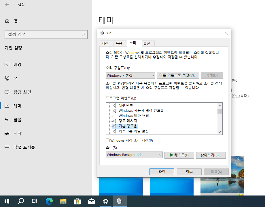 윈도우10 시작 > Windows 설정 > 개인설정 > 테마 > 소리