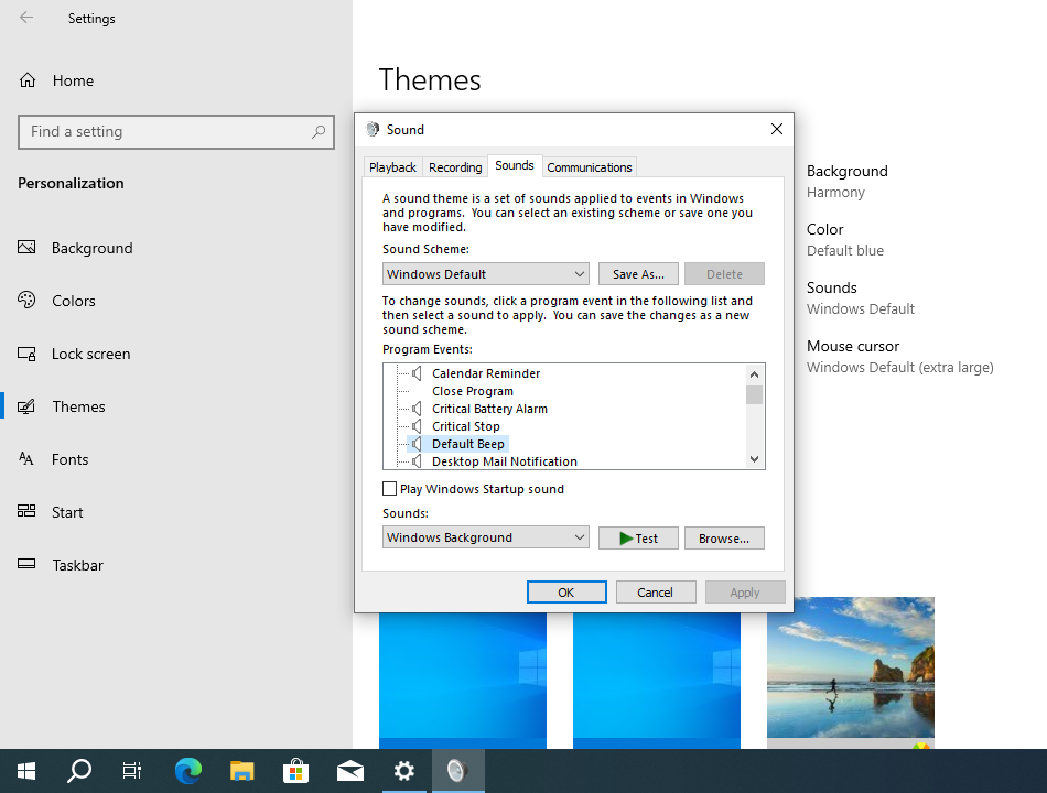 Start > Windows Settings > Personalization > Themes > Sound (Default Beep)