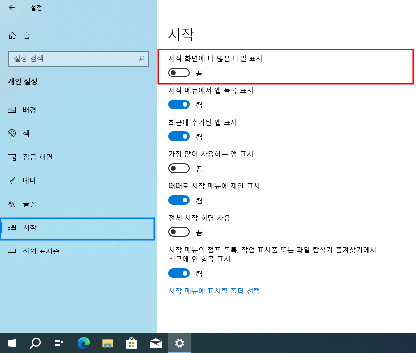 윈도우10 시작 > Windows 설정 > 개인설정 > 시작