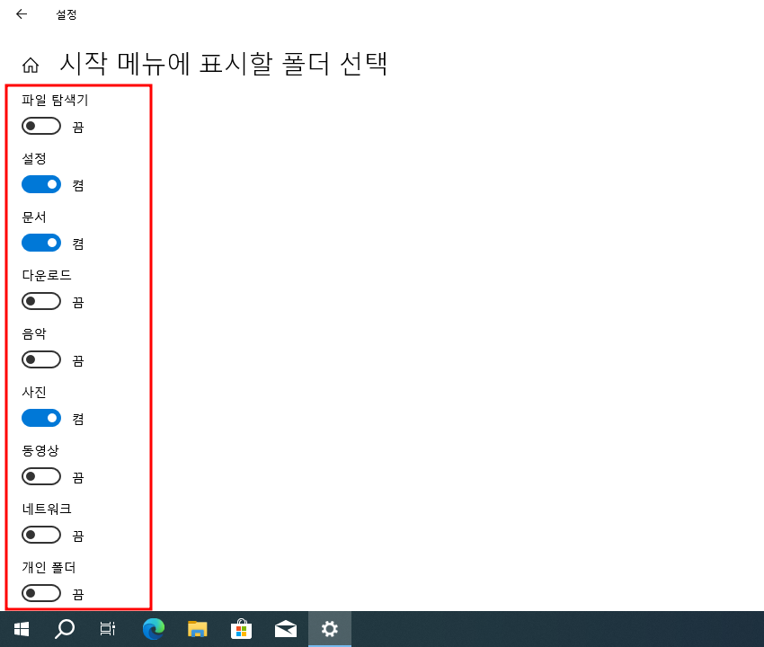 시작 메뉴에 표시할 폴더 선택 - 모든 항목 켬(On) 설정 시 화면 예시