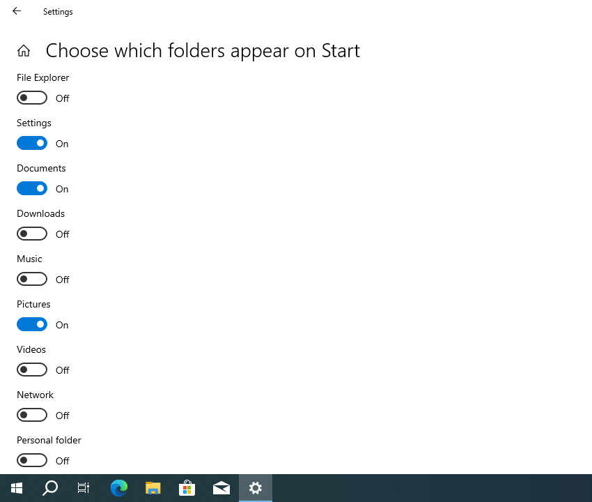 시작 > Windows 설정 > 개인설정 > 시작 > 시작 메뉴에 표시할 폴더 선택