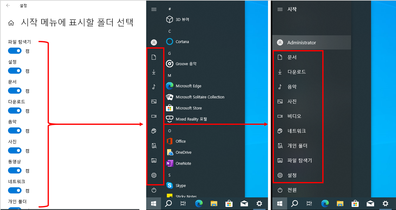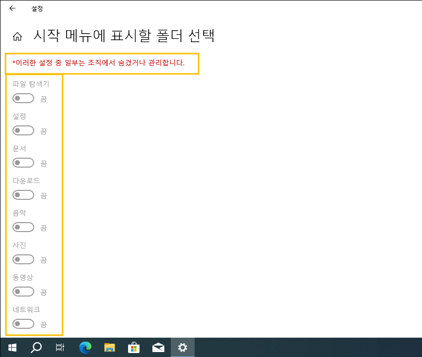 >> 시작 메뉴에 표시할 폴더 선택 : 모든 항목 '끔'(off) 설정
