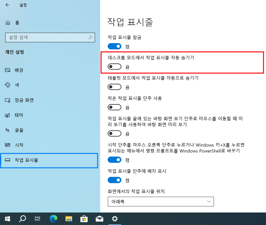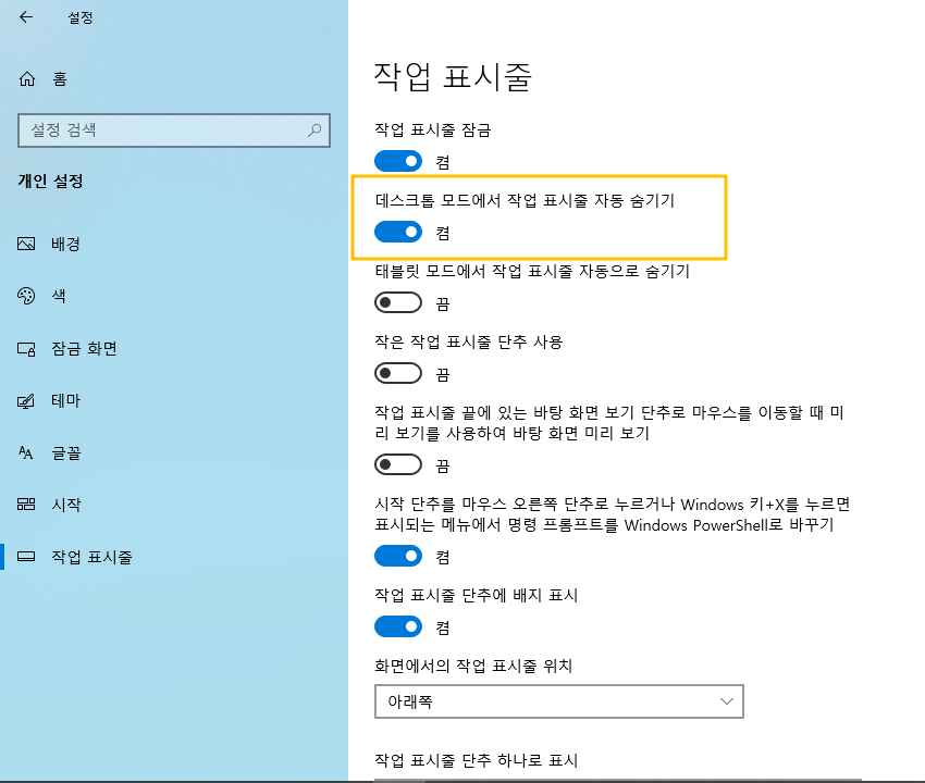 윈도우10 데스크톱 모드에서 작업 표시줄 자동 숨기기