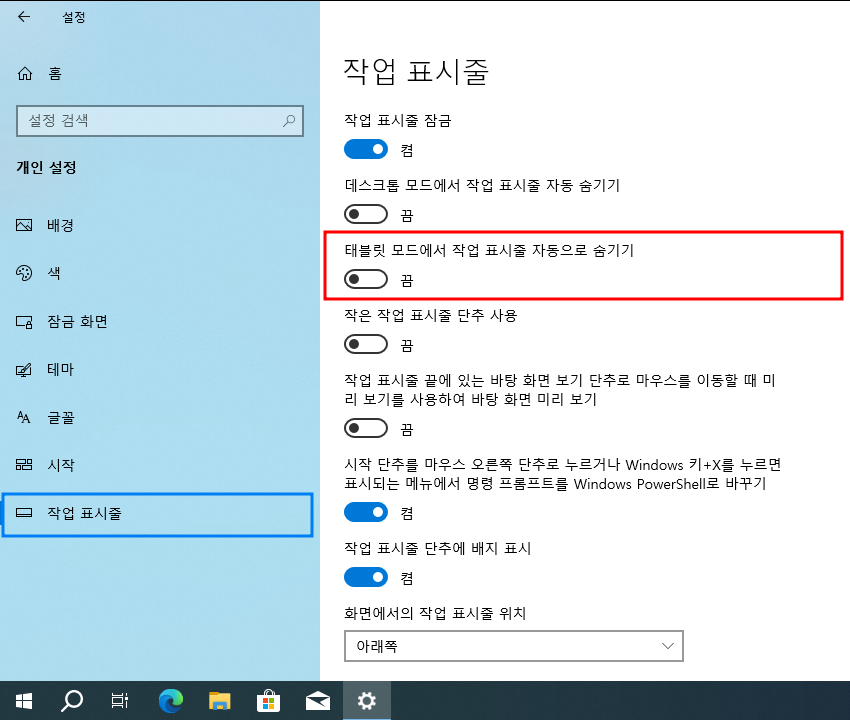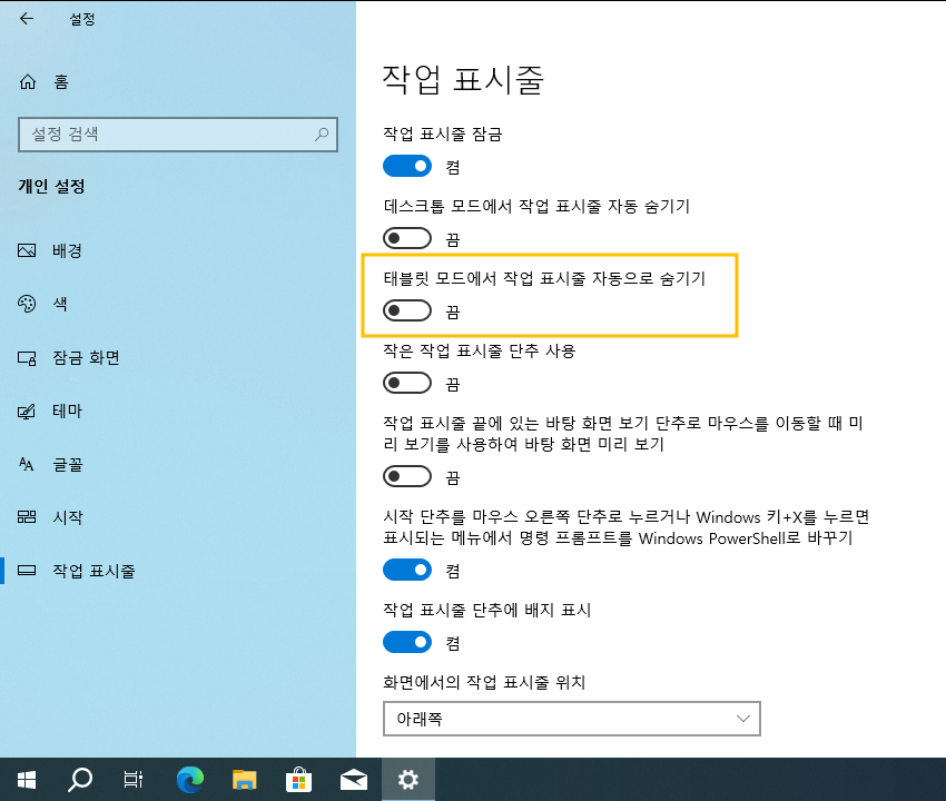 >> 태블릿 모드에서 작업 표시줄 자동으로 숨기기 : 끔 (Off)