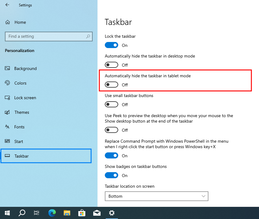 REM Windows 10 Automatically hide the taskbar in tablet mode -Off