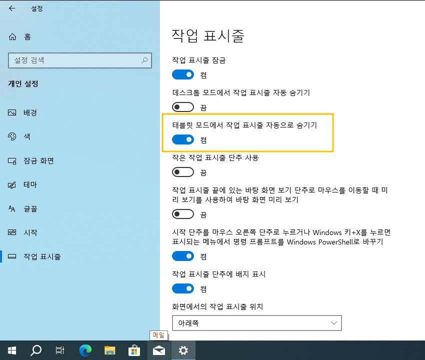 윈도우10 태블릿 모드에서 작업 표시줄 자동으로 숨기기