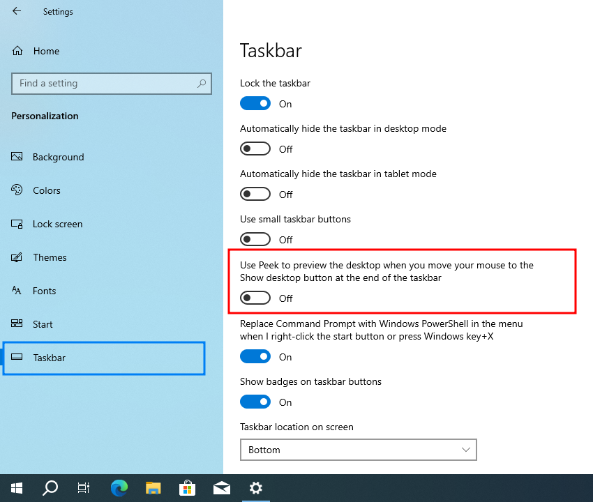 Windows 10 Use Peek to preview the desktop when you move your mouse to the Show desktop button at the end of the taskbar