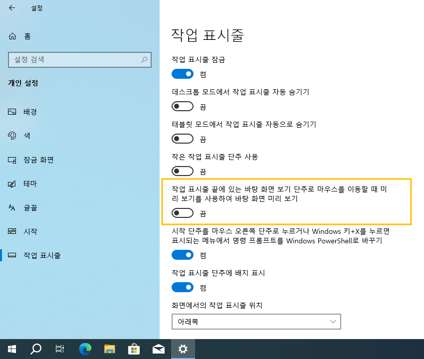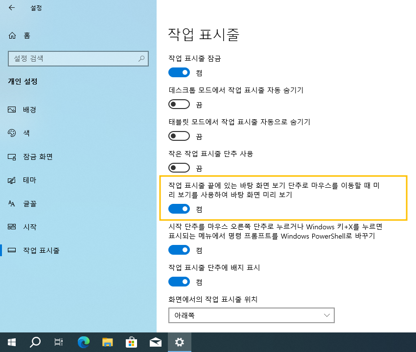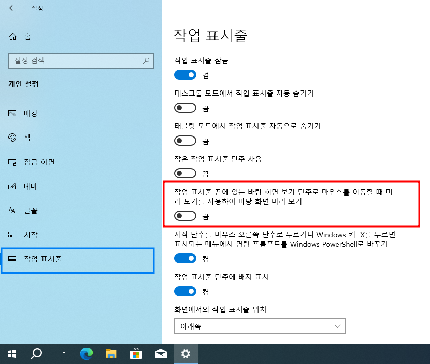 시작 > Windows 설정 > 개인 설정 > 작업 표시줄