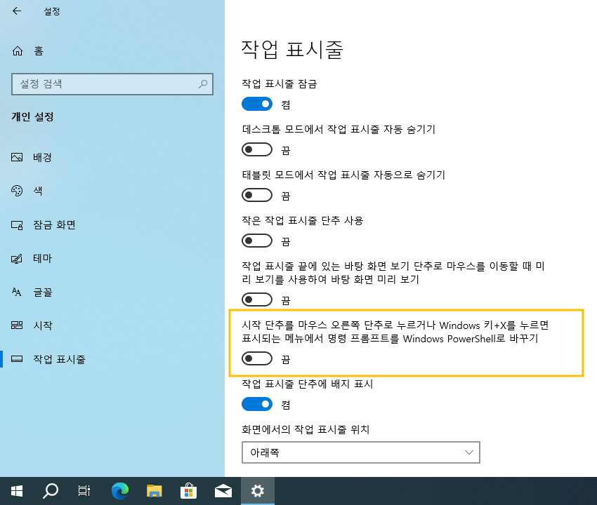 >> 시작 단추를 마우스 오른쪽 단추로 누르거나 Windows 키+X를 누르면 표시되는 메뉴에서 명령 프롬프트를 Windows PowerShell로 바꾸기 : 끔 (Off)