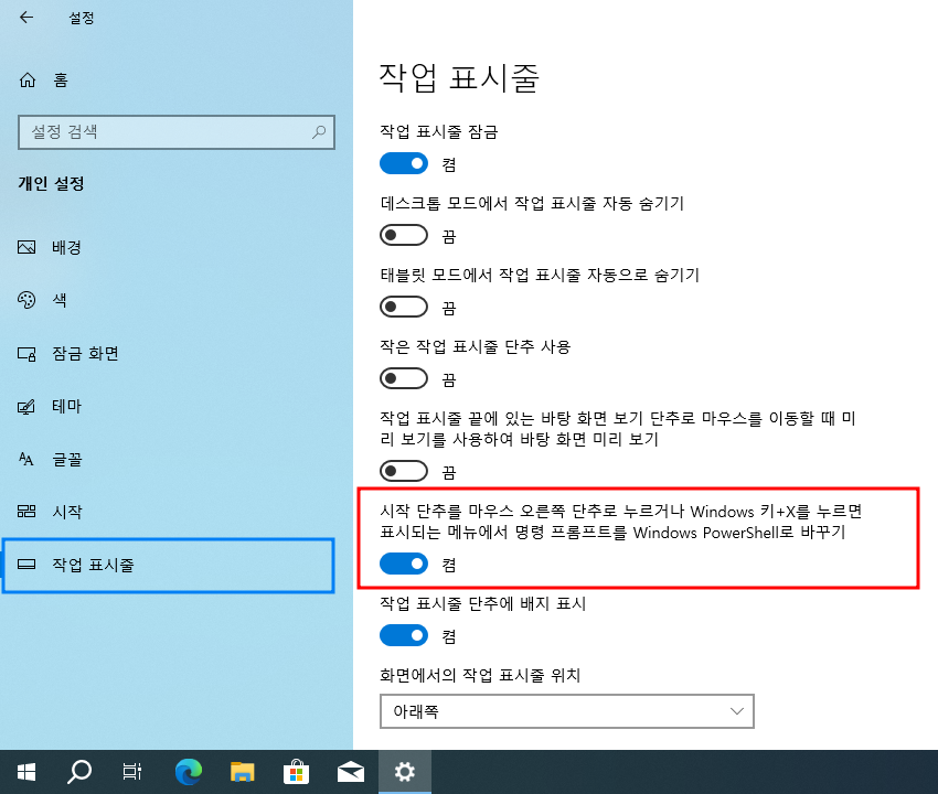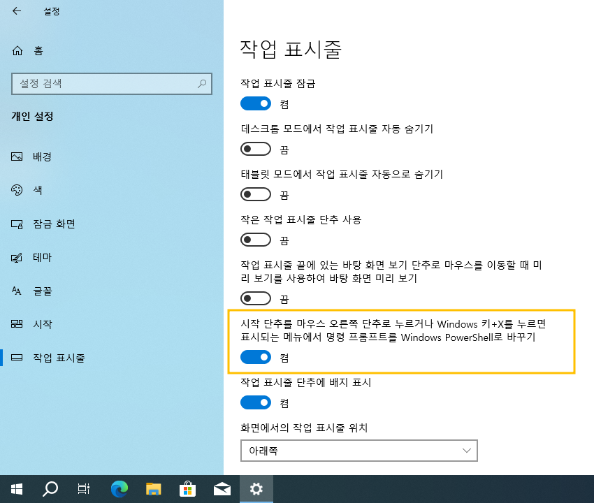 >> 시작 단추를 마우스 오른쪽 단추로 누르거나 Windows 키+X를 누르면 표시되는 메뉴에서 명령 프롬프트를 Windows PowerShell로 바꾸기 : 켬 (On)
