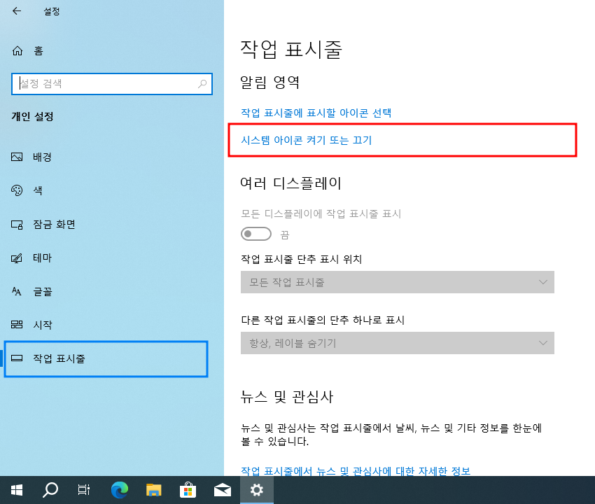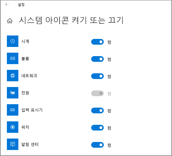 시작 > Windows 설정 > 개인 설정 > 작업 표시줄 > 알림 영역 > 시스템 아이콘 켜기 또는 끄기