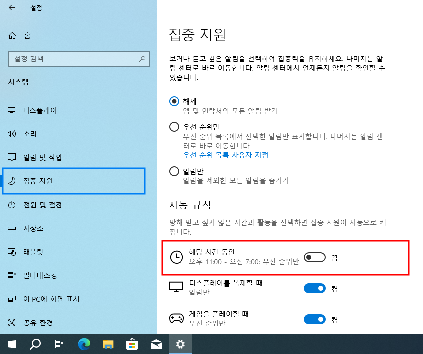 시작 > Windows 설정 > 시스템 > 집중 지원