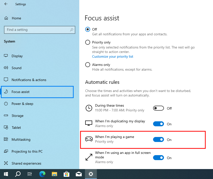 REM Windows 10 Focus assist - Automatic rules - When I'm playing a game -Off