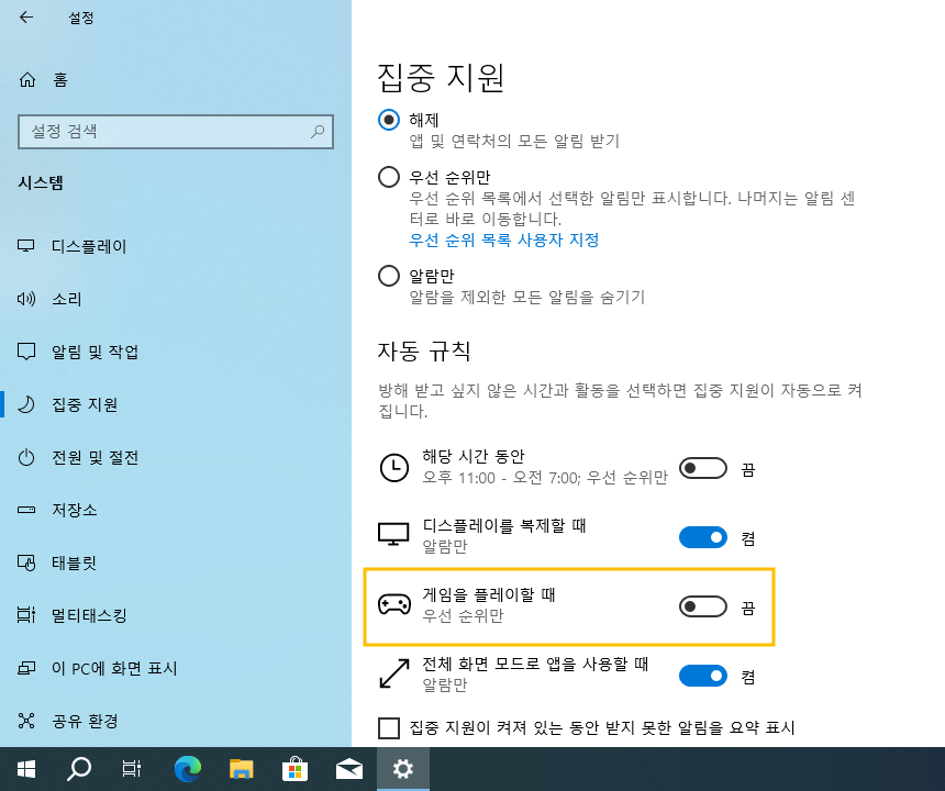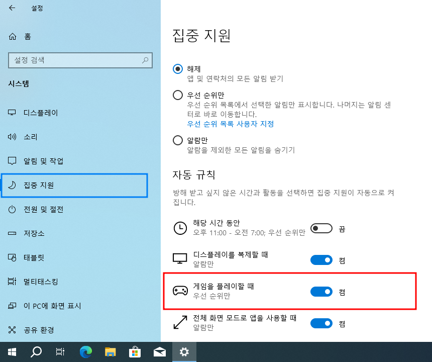 윈도우10 시작 > Windows 설정 > 시스템 > 집중 지원 > 자동 규칙