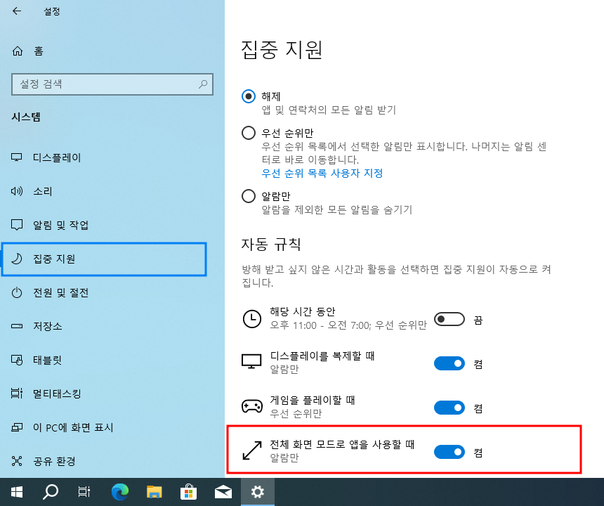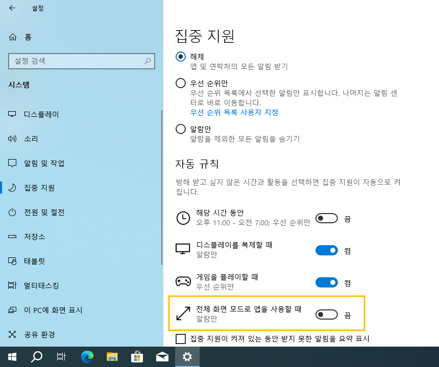 윈도우10 시작 > Windows 설정 > 시스템 > 집중 지원 > 자동 규칙