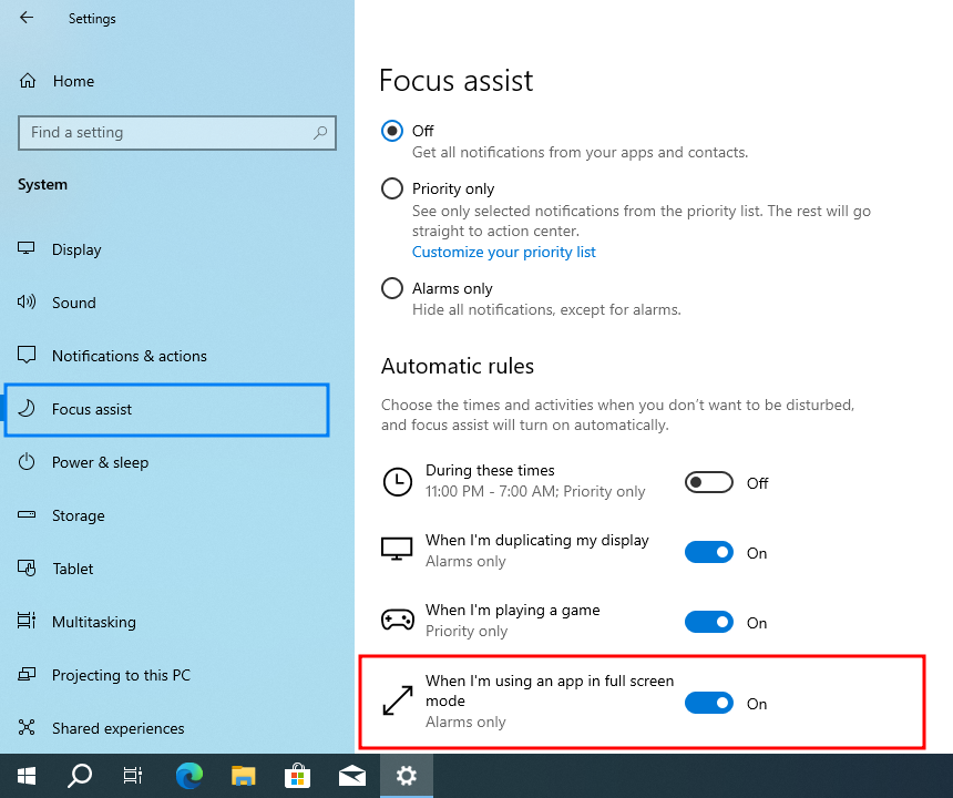 REM Windows 10 Focus assist - Automatic rules - When I'm using an app in full screen -Off