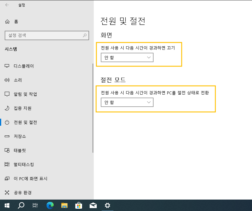 >> 전원 사용 시 다음 시간이 경과하면 PC를 절전 상태로 전환 : 안 함 (Never)