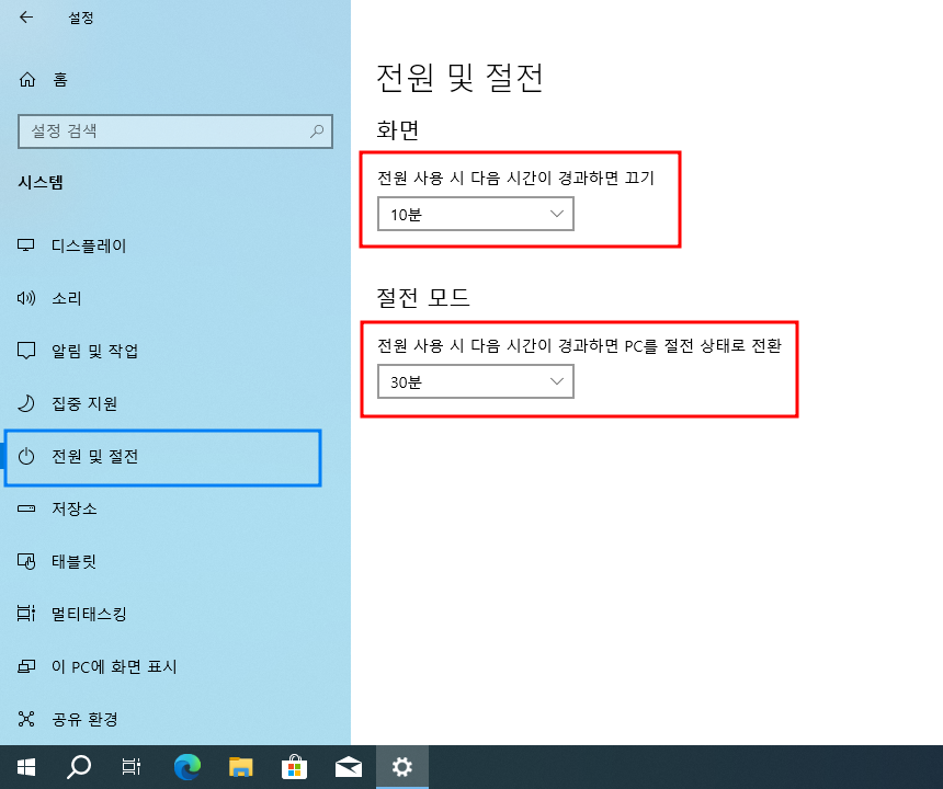 윈도우10 시작 > Windows 설정 > 시스템 > 전원 및 절전 > 절전 모드