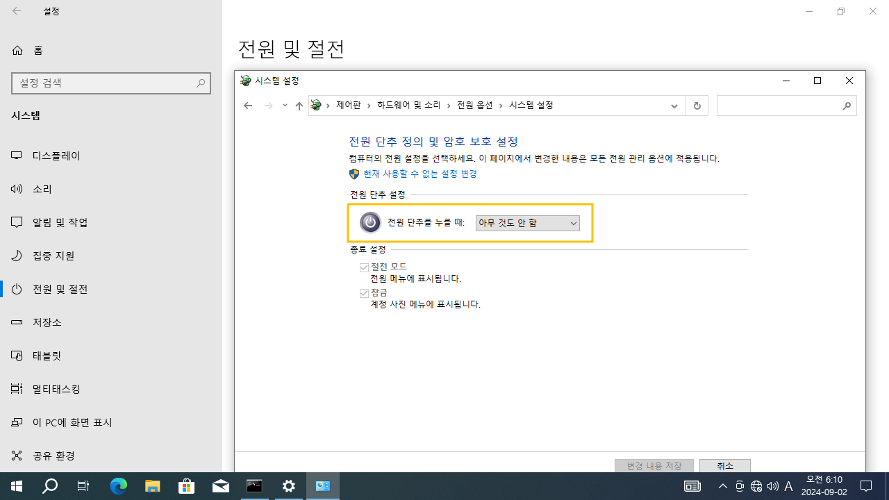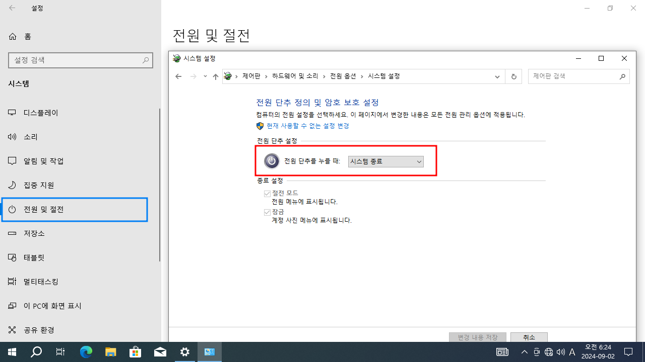 제어판 > 하드웨어 및 소리 > 전원 옵션 > 시스템 설정 > 전원 단추 정의 및 암호 보호 설정 > 전원 단추 설정