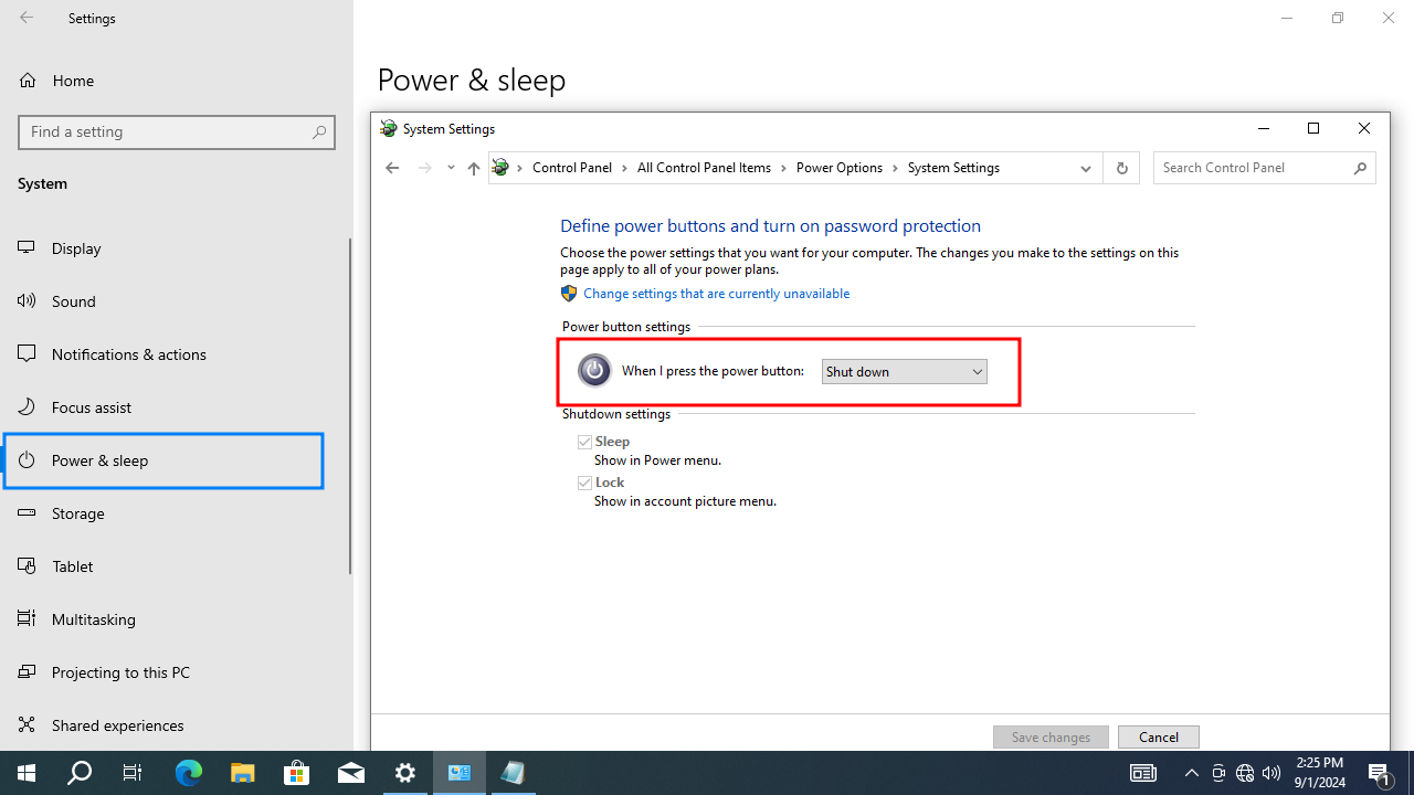 Control Panel > All Control Panel Items > Power Options > System Settings > Define power buttons and turn on password protection > Power button settings