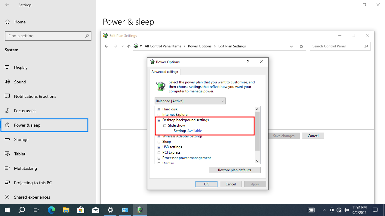 REM Windows 10 Advanced power settings - Desktop background settings - Slide show -Paused