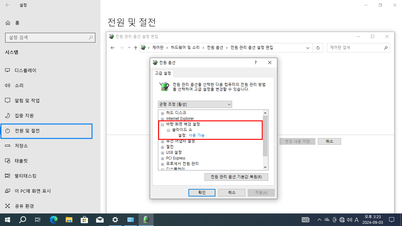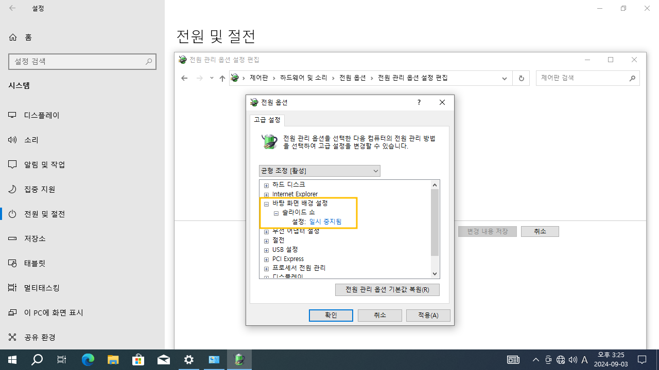 제어판 > 하드웨어 및 소리 > 전원 옵션 > 전원 관리 옵션 설정 편집 > 고급 전원 관리 옵션 설정 변경