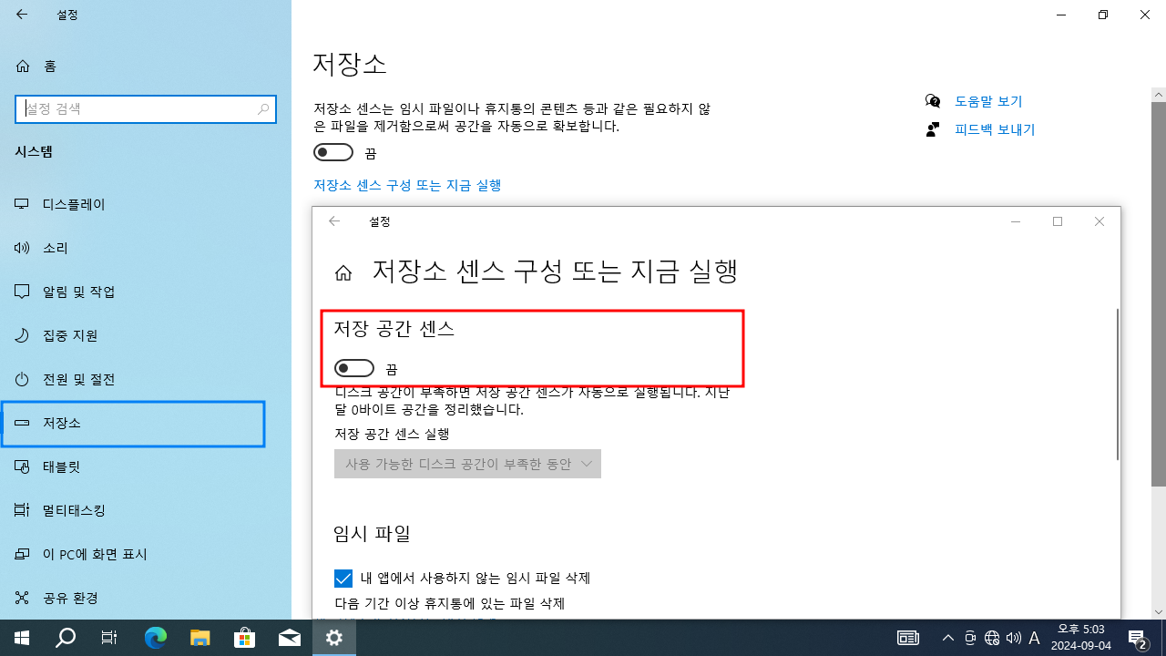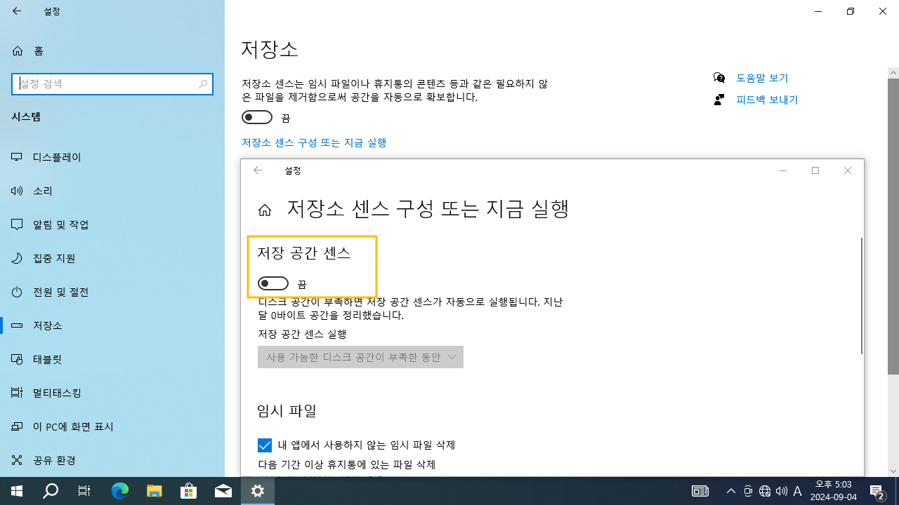 >> 저장 공간 센스 : 끔 (Off)