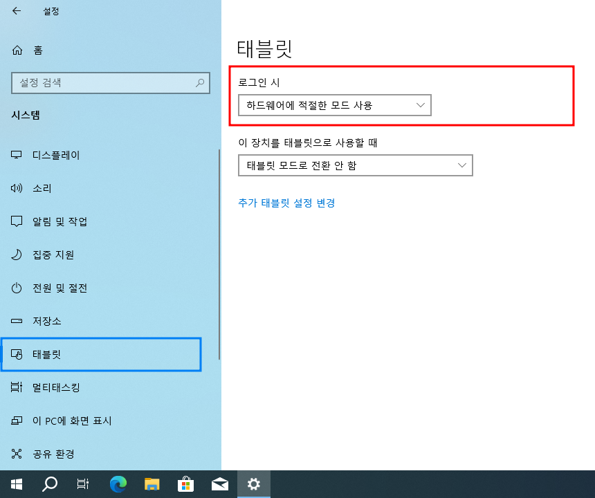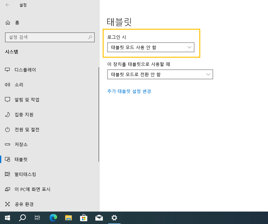 윈도우10 시작 > Windows 설정 > 시스템 > 태블릿
