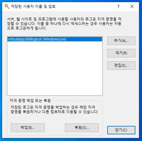 윈도우 사용자 저장 자격 증명 관리 (저장된 사용자 이름 및 암호)