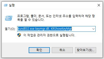 rundll32.exe keymgr.dll, KRShowKeyMgr 을 입력하고 Enter 버튼을 누릅니다.