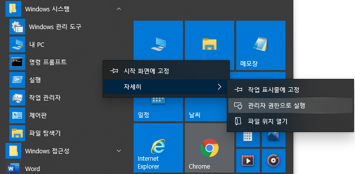 윈도우 시작 메뉴 - Windows 시스템 - 명령 프롬프트 - 마우스 오른쪽 버튼 - 자세히
